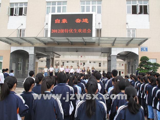 大会由学校分管毕业班的教学副校长聂晓云主持,首先学生代表陈曦代表即将离开的同学对母校和老师表达了深深的谢意,随后由九班的杨洋代表留下的同学表达了他们奋战6月的信心与决心,最后,学校唐中福校长代表学校作了热情洋溢的讲话,他首先强调了这次大会的目的是欢送与勉励,紧接着分别对两部分同学提出了殷切的希望,特别强调了6月的金中外实会因还在奋战中考的同学而更加光辉灿烂,最后唐校长指出,2012级是新校区的第一届毕业生,所创造的辉煌必在校史上留下辉煌的一页。大会的第二个程序由即将离开母校的特长生在题为“今天我以金中外实为荣,明天金中外实以我荣”的横幅上签名留念,整个场面情深意切,同学们饱含深情的写下了自己的姓名,以示留念。