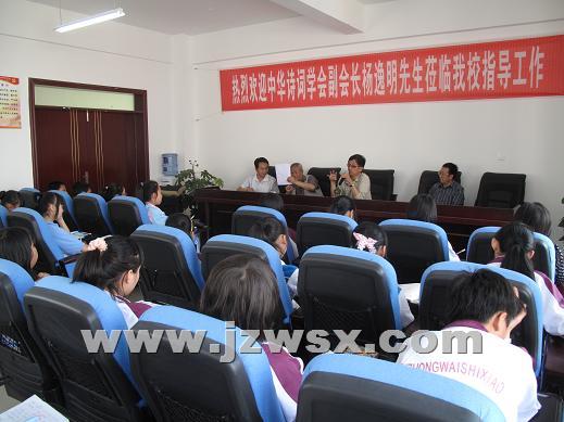 2012年5月14日下午15:20整,金堂中学外国语实验学校图书馆三楼会议室传来阵阵热烈的掌声。中华诗词学会副会长杨逸明先生受邀莅临我校指导工作并做了专题讲座,与会嘉宾还有金堂诗词研究的泰斗杨源仁先生和著名作家余勋禾先生(流沙河的弟弟)。学校全体语文老师和校翰墨文学社的全体成员参加了这次讲座。副校长聂晓云主持会议