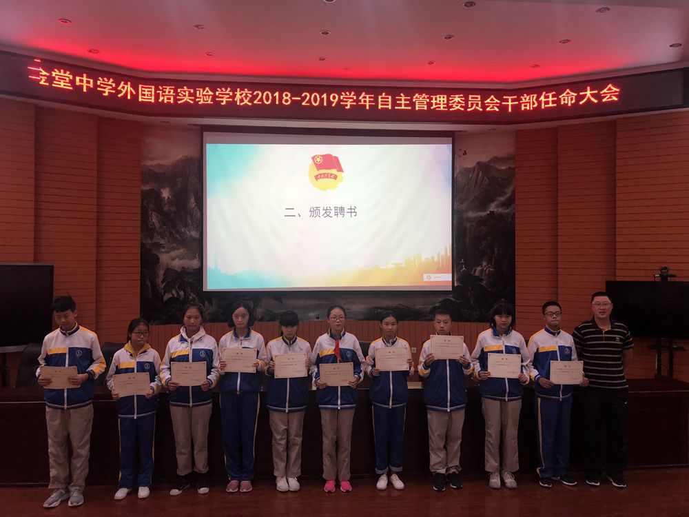 德育处主任助理吴春颖公布了新一届学生自主管理委员会干部名单,并举行了聘书颁发仪式。分管学校德育工作的肖校长,德育处邓主任,马主任,杨助理为各位学生干部颁发了聘书。