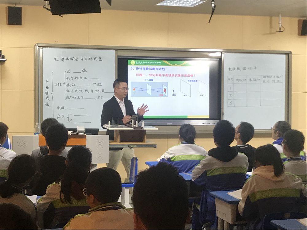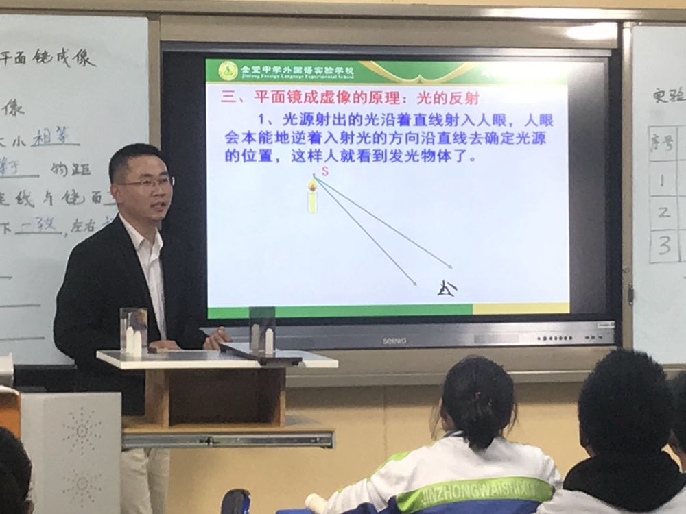廖老师以神奇的魔术引入新课,引发了学生对平面镜成像无限的思考,再以丰富多彩的实验寻找到了平面镜各种特点。