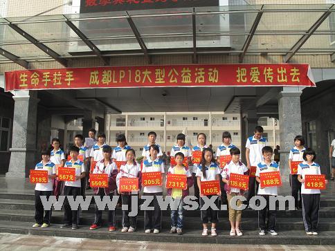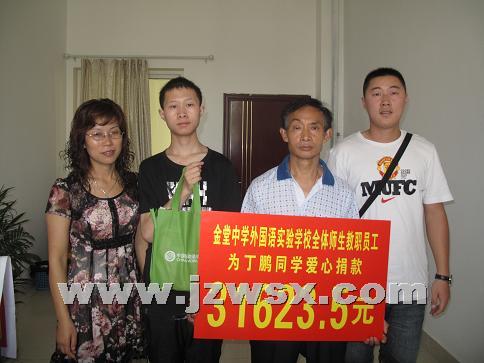 2012年7月6日上午8:30,在金堂中学外国语实验学校音乐广场举行了2011-2012学年度下期散学典礼暨为丁鹏同学爱心捐款捐赠仪式。德育处主任刘昀主持爱心捐款捐赠仪式,学校党支部书记、校长唐中福亲自将全校教职员工和学生捐款共计32043.5元(现场又有师生捐款420元)交给丁鹏同学及其爷爷丁瑞清老人。丁瑞清老人向学校赠送了 “助贫大爱、深恩浩荡”的锦旗,丁鹏同学宣读了感谢信,感谢给予他及其家庭帮助的所有人,他立誓将继续努力学习,报答社会!
