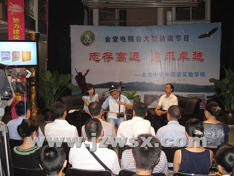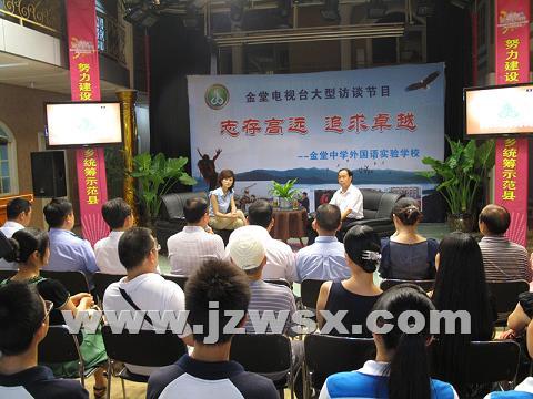 7月26日下午3:00,由金堂中学外国语实验学校主办的金堂县电视台大型电视访谈节目“志存高远,追求卓越—金堂中学外国语实验学校”在金堂电视台演播厅隆重举行。来自学校的学生、家长、教师以及社会各界代表共50人参加了此次活动。县教育局副局长吴伟首先就金堂中学外国语实验学校成立、县城赵镇初中教育布局调整作了说明。县食品药品监督局领导就加强学校的食品卫生督查做了说明,就金堂中学外国语实验学校在食品卫生方面尤其是在学校食堂管理方面所做的工作给予了充分肯定。赵镇水城派出所住校民警就学校周边环境整治、警校共育等工作做了说明,对金堂中学外国语实验学校在过去的一学年未发生一起安全事故所取得的成绩表示肯定。县关工委领导张英文就学校、家庭、社会如何加强联系、关心教育发表了意见和建议。访谈会上,学校校长唐中福就金堂中学外国语实验学校成立三年来所取得的成绩作了介绍,对社会、家长、学生所关心的问题一一作了说明,对学校未来三年发展规划进行了展望。学校分管教学的副校长聂晓云、分管德育的副校长王敏分别就学校教学工作、德育工作情况作了说明。访谈会上,学生代表的二胡演奏充分展示了学校素质教育取得的成果。整个电视访谈节目取得了圆满成功。