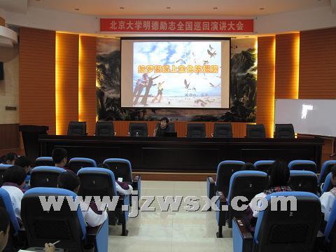 2012年10月19日下午两点,北京大学研究生侯卓莅临我校学术报告厅作明德励志演讲,学校通过校园电视台同步直播,全校师生认真收看了此次讲座。侯老师讲座的主题是:“给梦想插上金色的翅膀”,侯老师结合自身的经历,分四个部分为大家作了精彩演讲:1、学习方法的介绍 2、心理调试方法 3、学会感恩 4、大学生活的展望 。最后的互动环节,学生积极提问,侯老师一一解答。通过这次讲座,学生不但得到了学习方法的启迪,也进一步懂得了学会感恩、学会感激。