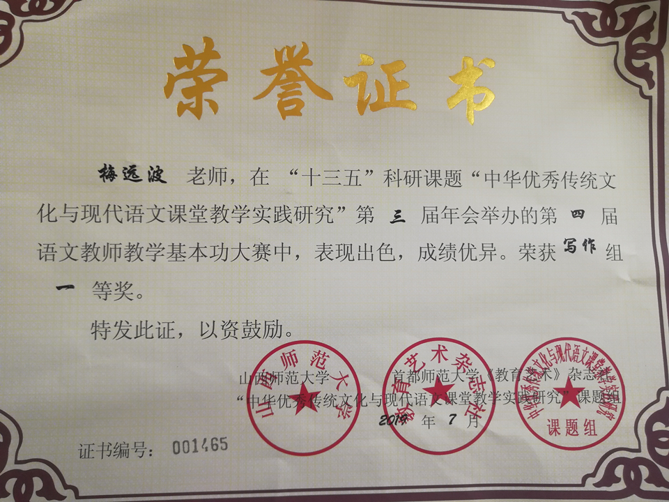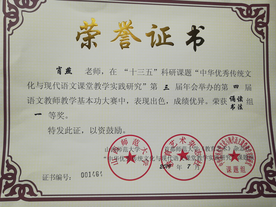 2019年7月,“十三五”科研课题“中华优秀传统文化与现代语文课堂教学实践研究”第三届年会在辽宁盘锦召开。我校肖燕老师在大会举办的第四届语文教师基本功大赛中荣获诵读、抒发组一等奖,梅远波老师荣获写作一等奖和诵读、书法组二等奖。