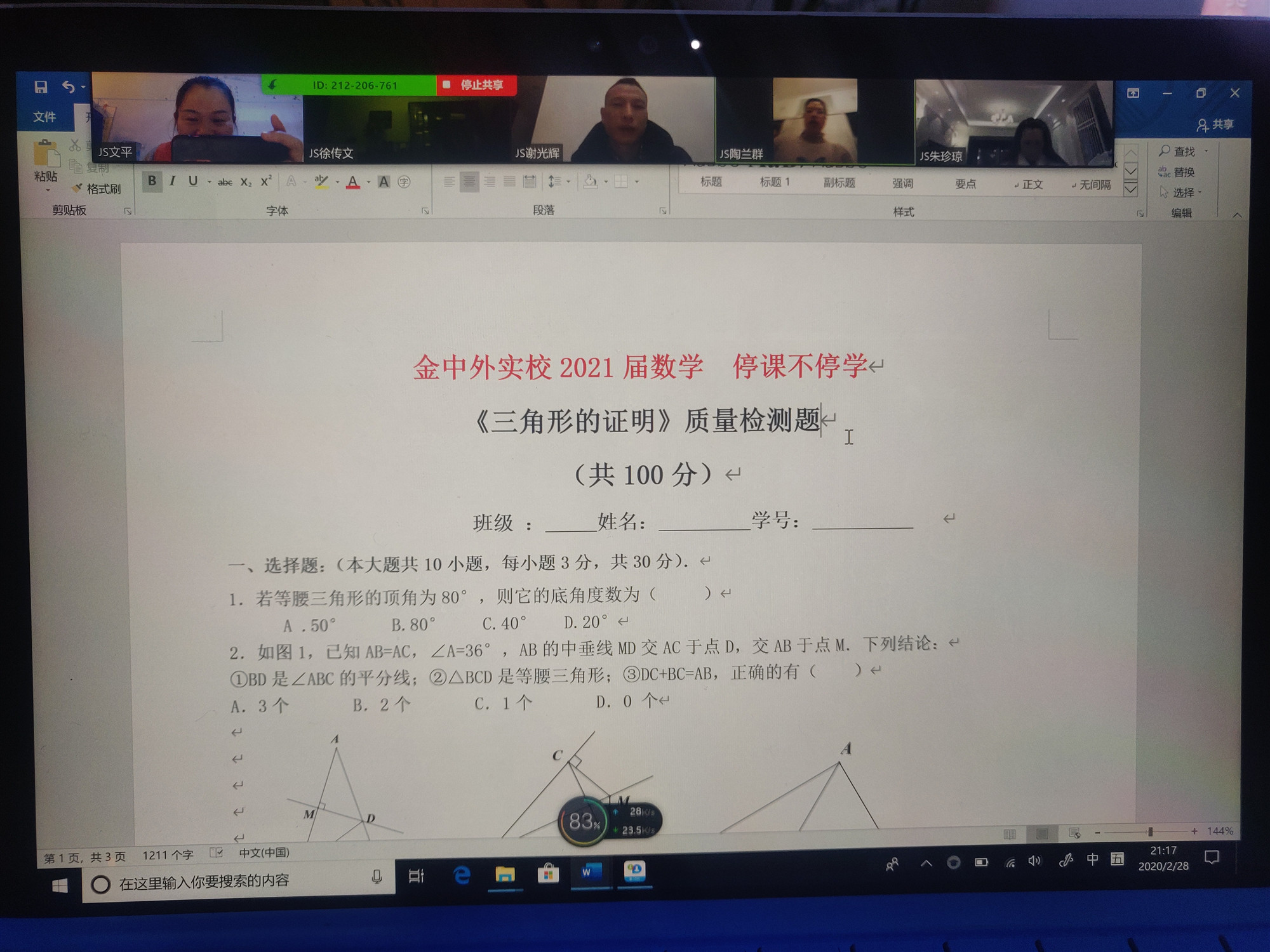 2020年伊始,一场疫情打破了我们开学的节奏,在这特殊时期,就“停课不停学,如何有效提高学生网上辅导效率”学校开展了一系列线上教研活动。在2月28日晚上20点,八年级数学组全体教师积极响应,准时上线,再次开展我们的这次教研活动。本次会议由学科带头人、教研组长文平老师主持: