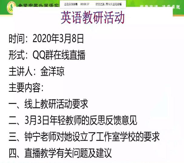在3月8日这个特殊的节日里,下午2:30金堂中学外国语实验学校英语组的全体成员再次在线上集合,开展了本学期纪律严明、内容丰富的第三次英语教学研讨会。在此次大会上,全体成员准时地进入了会议直播群,在金洋琼老师的主持下,开始了此次会议议程。