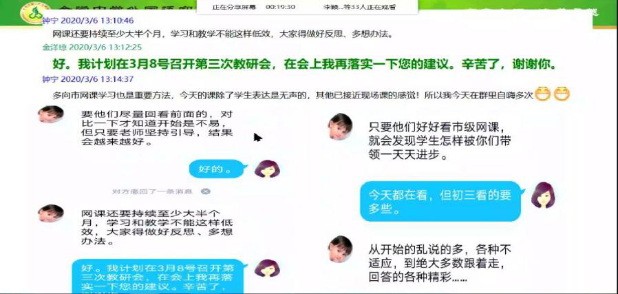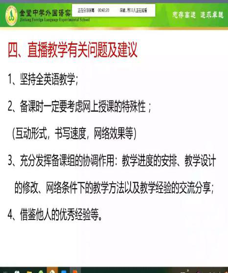 最后金老师和大家分享了直播教学的有关问题及建议,比如:坚持全英语教学;考虑网课特殊性进行备课等等。参加会议的每个人老师都受益匪浅。还在会议结束前,带领大家再次进行了热烈的探讨。