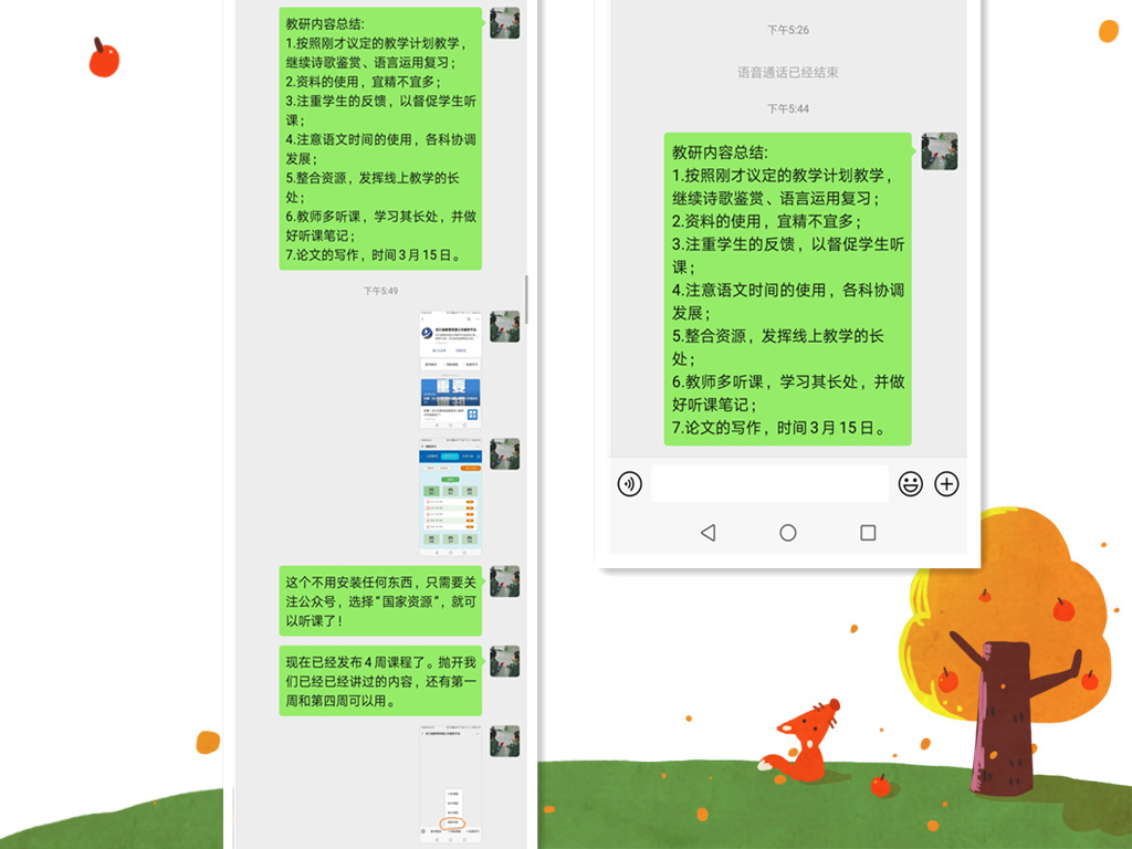 为了便于会议的召开,本组采用了微信群聊的方式教研。针对学生学情,我们确定了下周的教学进度,对诗歌鉴赏和语言运用进行深入复习。对于线上教学大家达成了一致意见:资料的使用,宜精不宜多;注重学生反馈,以督促学生听课;还要注意学科之间的均衡发展。组员之间还互相推荐了优秀的教育资源,如微信小程序、微信公众号等不增加学生额外负担的辅助工具。整合资源,发挥线上教学的长处,也是值得我们研究的方向。