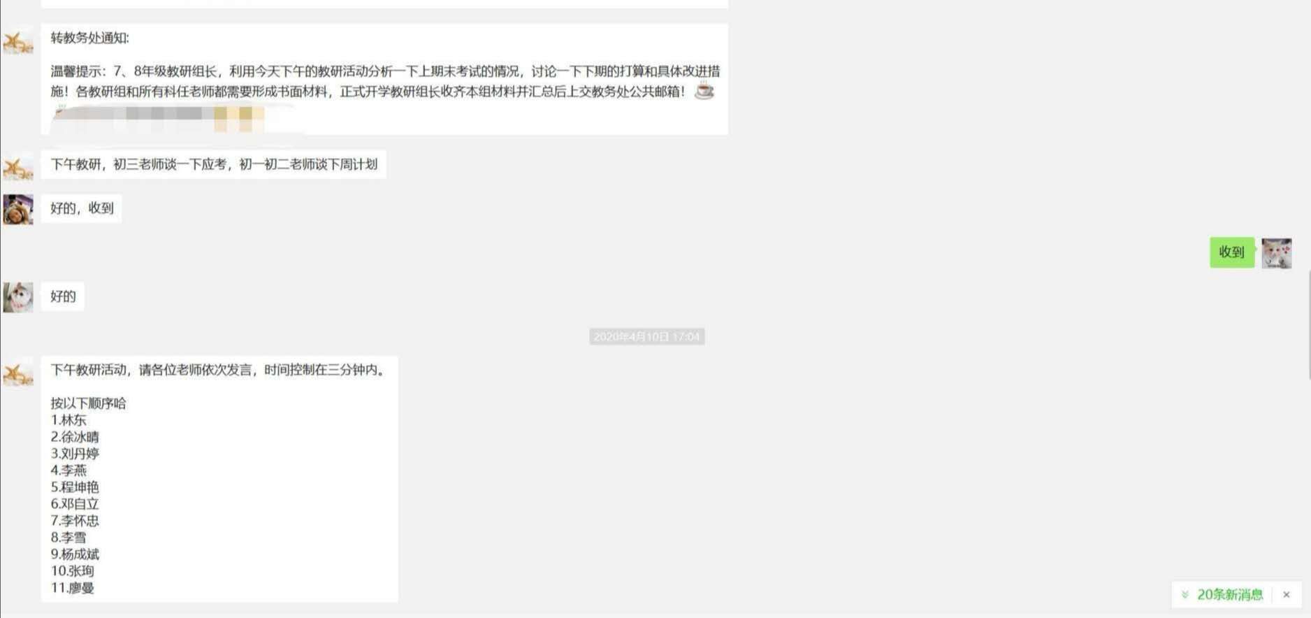 会议伊始,初三年级徐冰情老师就复课前的网课教学情况进行了总结,就网课教学的效果进行了交流探讨,提到要注重与如今的常规课堂衔接,对于网课教学中还未落实到位的相关内容要再强化,为迎战中考会考做好全面的复习准备。接下来,初二及初一年级老师就迎接学生返校,返校后相关教学计划做了相关探讨。学生复课后要做好学生的疫情防护工作,同时,各位老师也将以身作责,落实安全防护。