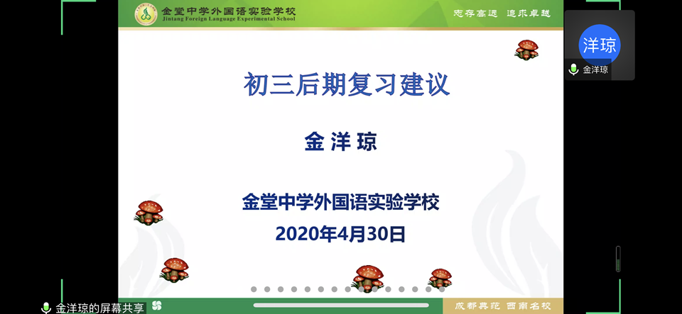 为了满足抗疫常态化的要求,将所有教育工作者的生命健康放在第一位,同时为了维护九年级疫情期间的教学常态,尽最大努力保证全县英语科目的教学成果,2020年4月30日上午九点,由金堂县教育研究和培训中心组织的“金堂县九年级英语网络教研”在腾讯会议上如期举行。这次是继疫情复课后本学期金堂县第一次开展的全县九年级英语的集体教研,金堂中学外国语实验学校2020级全体英语教师均准时全程参与了此次意义重大的教研活动。