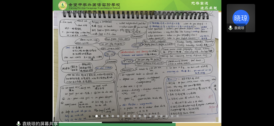 几位优秀的组长结合各校实际,围绕“思维导图”,分层提高,复习计划等主要方面进行了分享交流。来自金堂中学外国语实验学校2020级的英语教研组备课组长袁晓琼对我校疫情期间在金洋琼老师指导下的英语教研、教学方面的管理与要求以及具体操作进行了回顾与分享。接下来,袁老师深入细致地分享了我校复学后英语教学安排的三个阶段:话题复习;专题突破;中考模拟热身。并着重、具体地与全县英语教师分享探讨了话题复习中思维导图的应用操作。