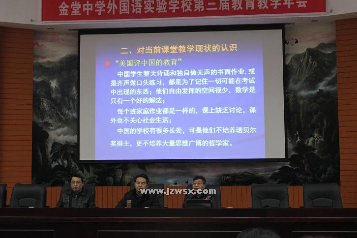 最后,校长聂晓云作了总结发言,他对此次教育工作年会给予了高度的肯定,再次给老师们提出了要杜绝低效、无效课堂的要求,号召大家群策群力、共同创办优质的金堂中学外国语实验学校。