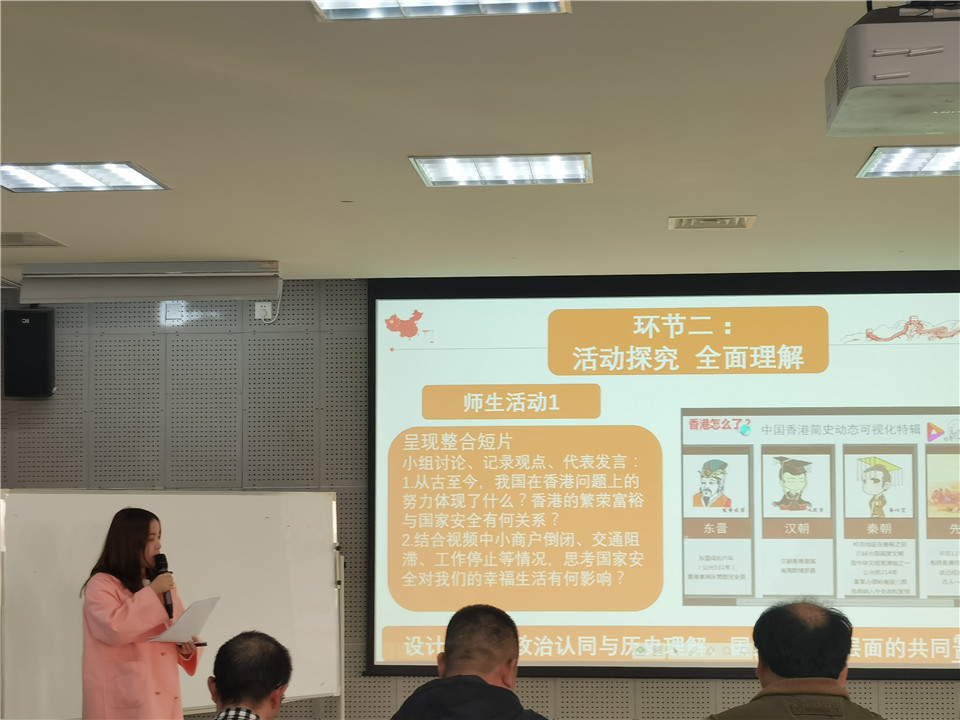 本次比赛八年级组的选题为《树立总体国家安全观》,要求将两框内容进行整合,说课时间控制在15分钟以内。为备战本次比赛,我校政治组全体成员提前进行了教材分析、说课分析。利用前一周的周二教研时间,邓自立老师在组内进行了提前的展示,本组成员出谋划策,提出了很多改进建议。在最终的比赛中不卑不亢,沉稳冷静的展现了自己的说课设计。