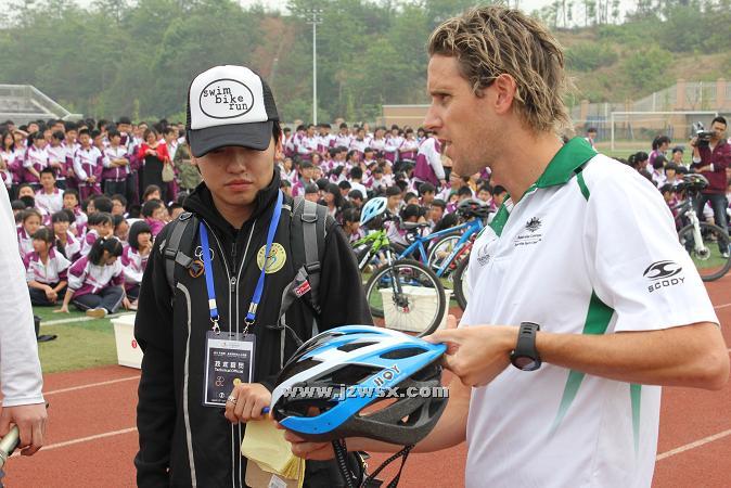 活动中,来自澳大利亚的优秀男运动员米切尔和美国女运动员劳伦进行了现场讲解示范。现场40多名学生和运动员进行了相互交流,同学们5人一组参与活动,跑步进入转换区,到自行车停放点穿戴好骑行装置,绕田径场骑行一圈,再回到转换区,推行自行车到开始停放的位置,停好自行车,放好骑行装置,再跑一圈,着实过了一把“铁人”瘾。