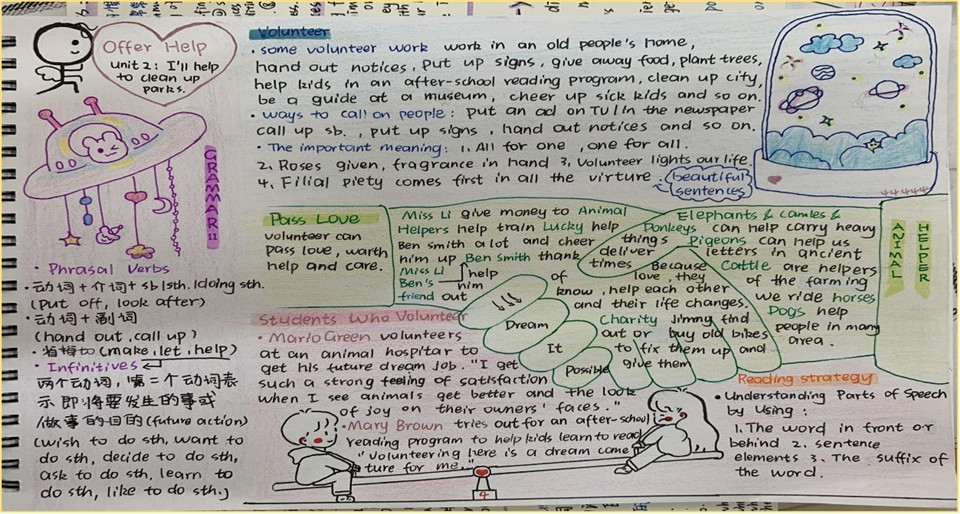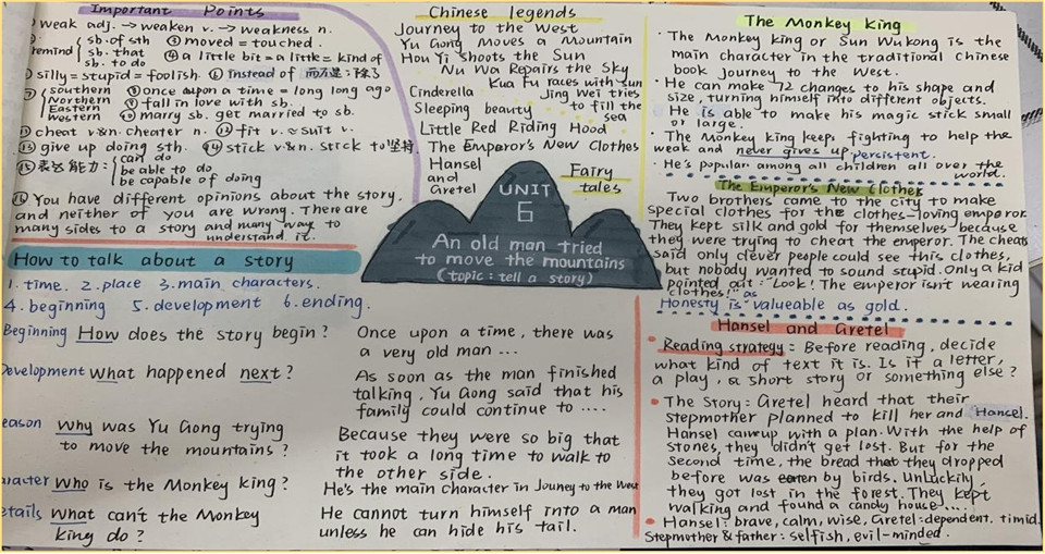 自2018年起,我校英语教研组全体英语教师一直坚持不懈地指导学生绘制每一个单元的思维导图,思维导图能较好体现学生的思考特点,因而具有较强的个性化特征,每个同学都对同一个话题有不同的表达,包括思维的连续性,批判性和发散性。思维导图也具有无限的发展性,从长远的角度分析,学生若坚持绘制思维导图,学习能力,思维的灵活性,做笔记的习惯等等都会得到较大的提升。