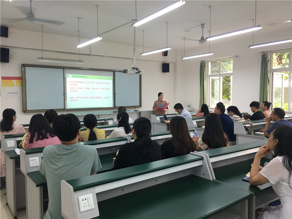 随后年级班主任代表江老师上台分享自己的班主任管理经验,巧用学生成长手册,助推班级管理进程。整个分享十分细致,给所有班主任提供了成熟的开学工作准备思路。同时,江老师的分享里提到她觉得当老师最幸福的事就是她工作18年来一直保持着对工作的热情和激情,而这样的一种幸福,无须他人,我们每一个人都可以随时送给自己。这引发了在场所有老师的共鸣。