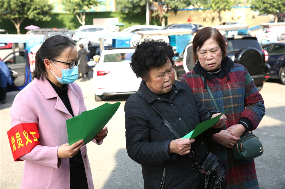 分批外出宣传的党员义工走上街头,进入菜市场、公园、社区积极的同路人、商贩宣传讲解。