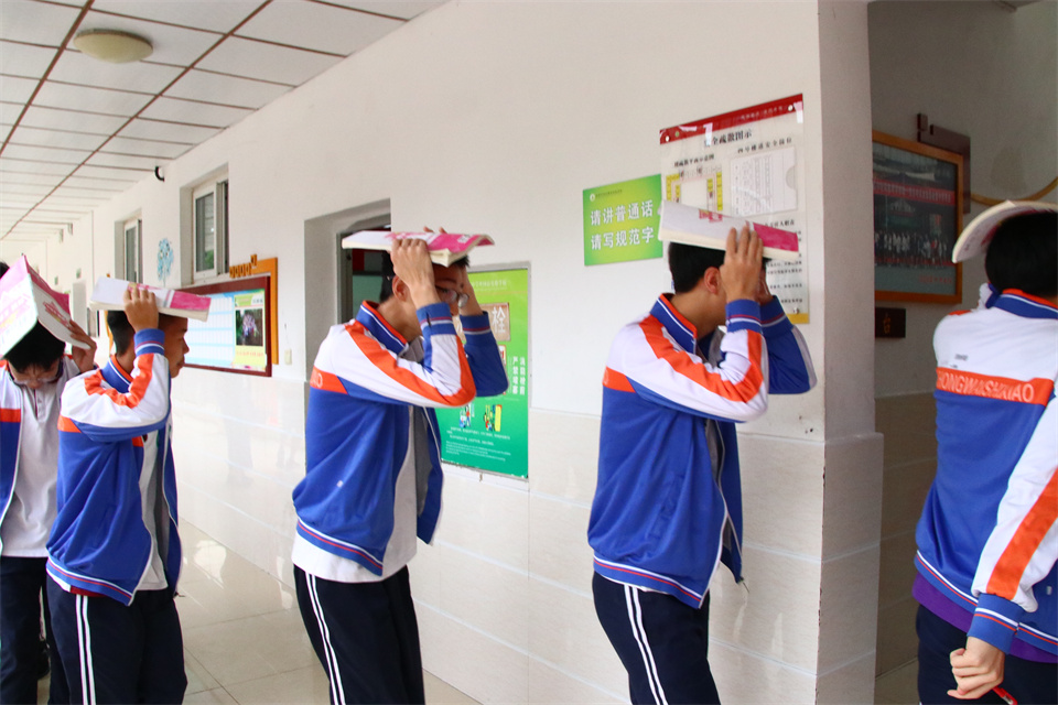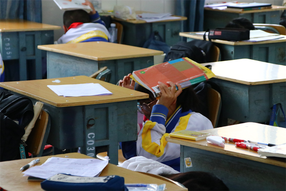 9点15分,随着警报声响起,演练开始。全体师生按照地震应急预案,立即开始紧急行动。安全疏散员打开教室门,保证疏散通道畅通;师生立即就地蹲在课桌下或者课桌旁,双手抱头或用书包保护头部,防止被砸伤。全体师生按照既定应急疏散路线,迅速有序撤离。各楼层、楼梯口、疏散路线上的安全员老师协助学生安全有序疏散到学校操场。整个过程学生们做到了迅速有序、沉着冷静。