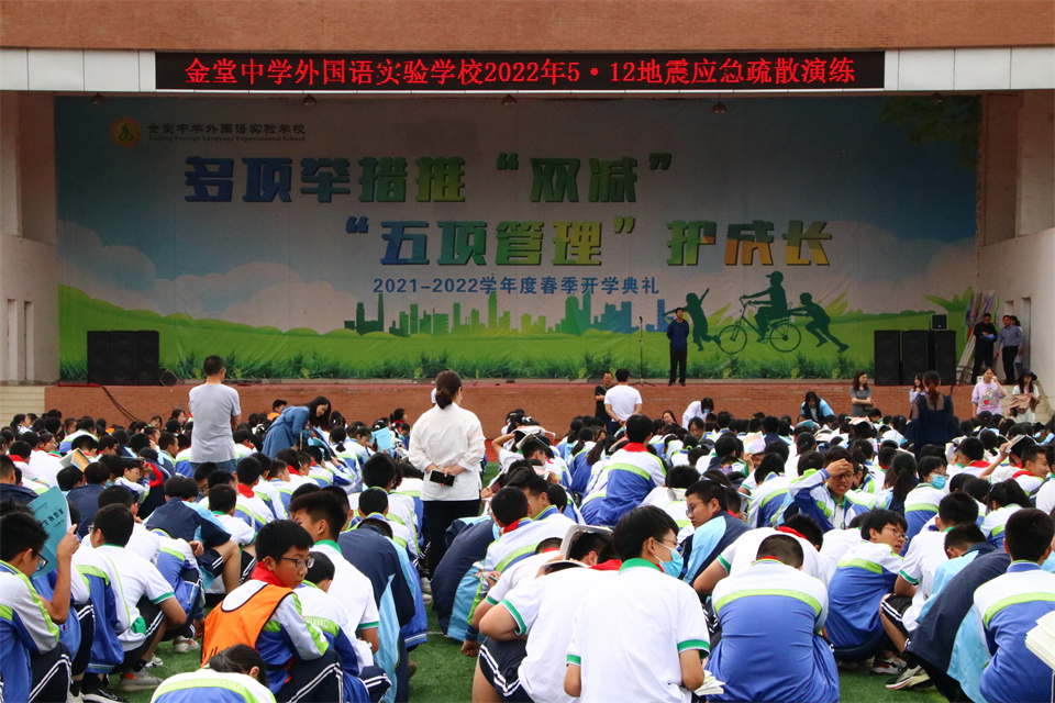 为贯彻落实“生命至上”理念,增强全体师生安全意识,提高学校有效防范和应对突发事件的能力,最大限度地减少突发灾害造成的损失,正值第14个全国防灾减灾日来临之际,5月10日,金堂中学外国语实验学校举办学校地震应急疏散实战演练,全校3000余名师生共同参与。