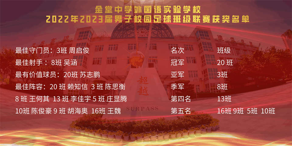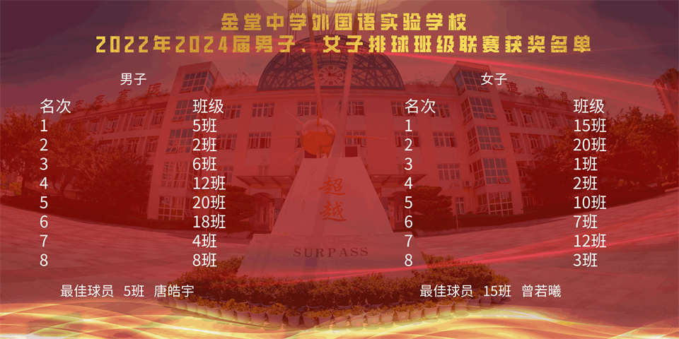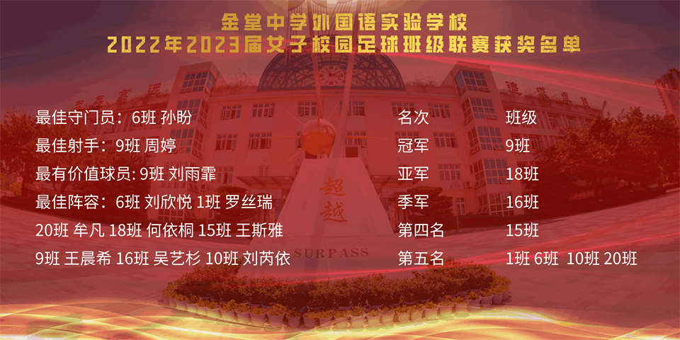 活力四射的金堂中学外国语实验学校2022年2023届校园足球班级联赛和金堂中学外国语实验学校2022年2024届排球班级联赛已经落下了帷幕,学校为获奖的班级和个人举行了隆重的颁奖典礼,让我们为运动健儿点赞!
