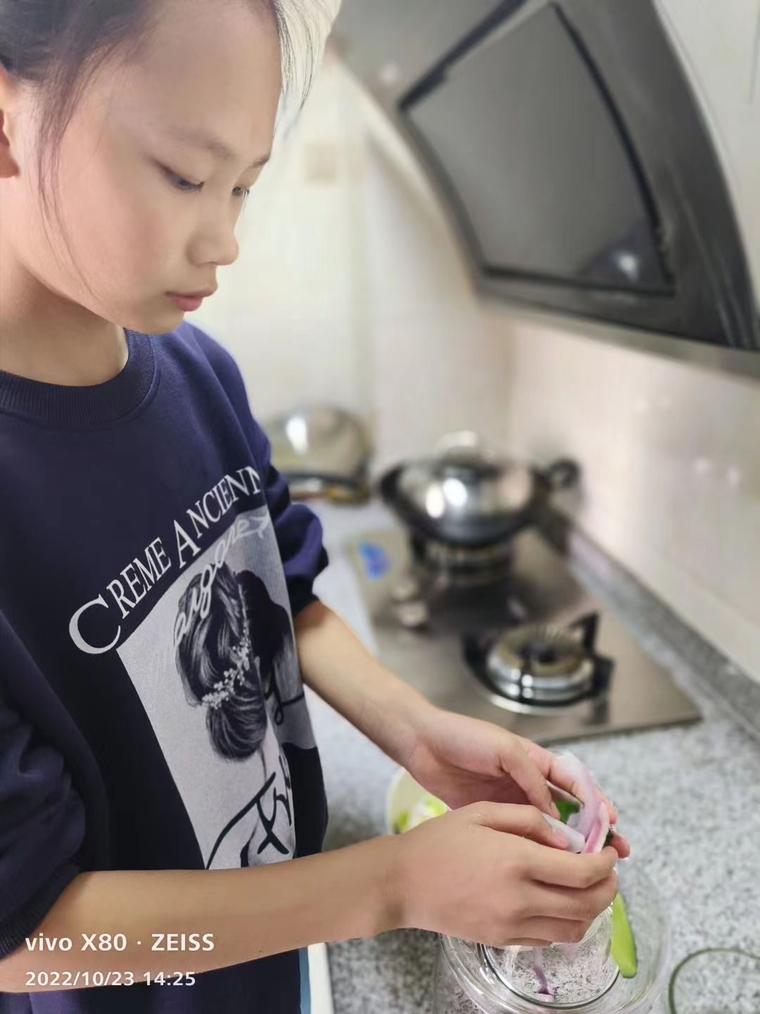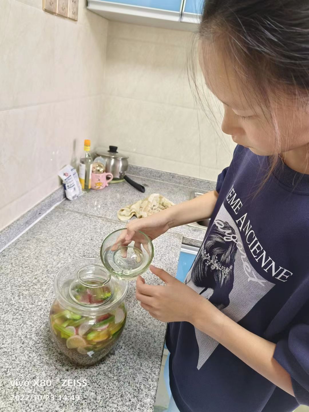 活动布置后,同学们积极参与到制作泡菜系列活动中去,通过拍照、录制视频展示制作过程,把做好的泡菜带到学校热情邀请同学、老师品尝,有的同学还创新制作了西式泡菜。看到学生们自制的泡菜色泽亮丽、尝一口酸爽可口,胡老师禁不住发朋友圈赞赏,引来众多老师纷纷表示可以帮忙品鉴……