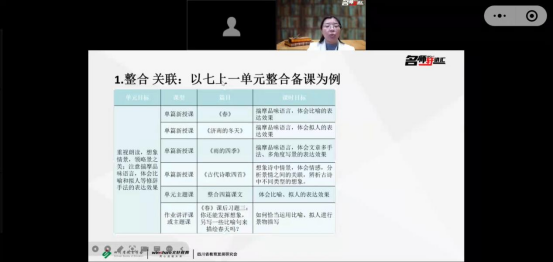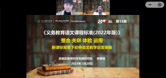 为提高专业老师的专业能力和核心素养,助力新一轮课程改革,2023年3月28日晚19:30-21:00,金堂中学外国语实验学校2025届语文组组织组内所有语文老师认真观看学习了由文轩教育名师轩讲汇针对初中语文学科开展的第12期第五场现场直播,成都市武侯区初中语文教研员、成都市未来名师李攀崎老师以“整合•关联•体验•运用——新课标背景下初中语文教学应变策略”为主题作了精彩的学习分享。