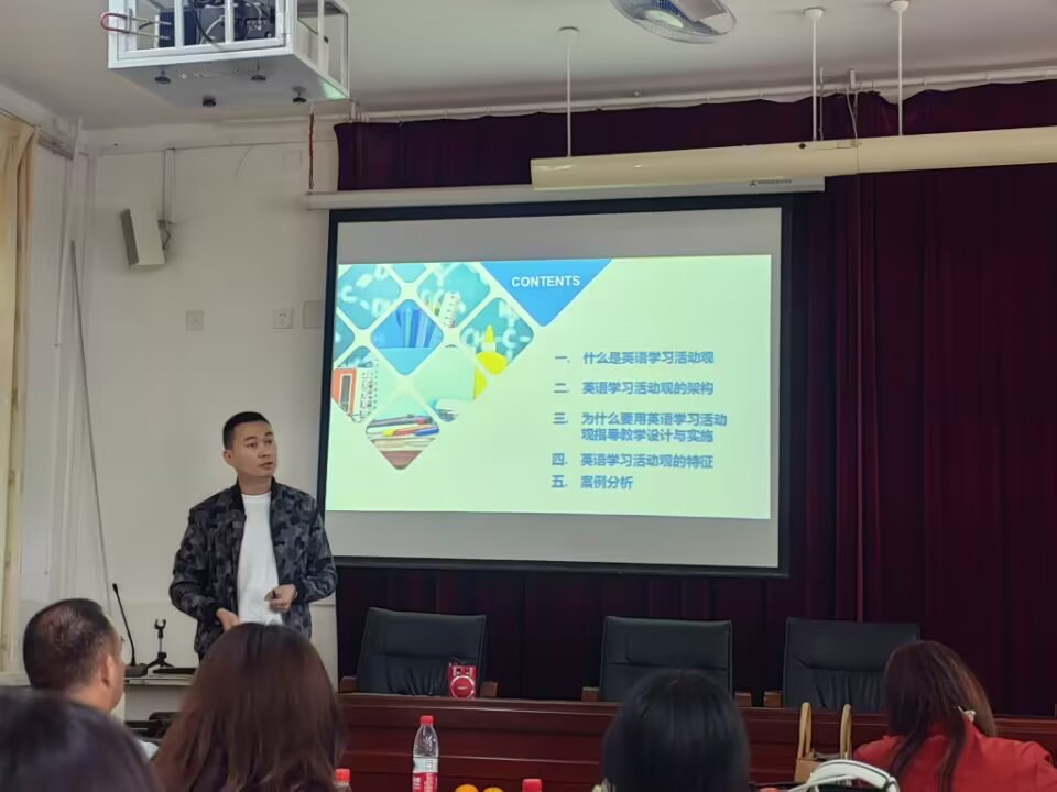最后,由我校青年教师樊代超老师分享了4月25日,参加成都市以“英语学习活动观”为主题的教研活动感想。樊老师提到,只有坚持学思结合、学用结合和学创结合,才能从基于语篇的学习走向深入语篇和超越语篇的学习,学生的语言能力、思维品质、文化意识的建构等方面才会不断发展和提升。
