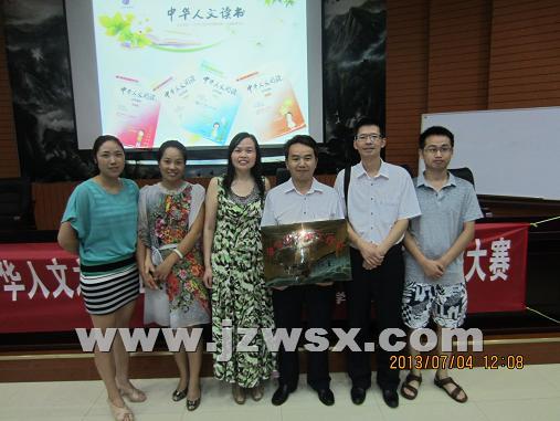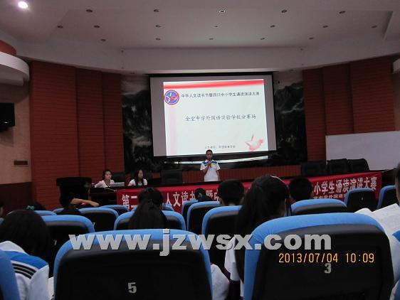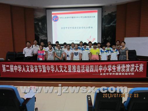 在“聂晓云名师工作室”全体成员精心的组织、训练、指导下,2013年7月4日,金堂中学外国语实验学校七、八年级40名同学参加了由教育部中国教育学会主办的“第二届中华人文读书节暨四川省中小学生诵读演讲大赛”金堂中学外国语实验学校分赛。此次分赛评委由组委会聘请聂晓云、詹绪涛、钟惠玲、李燕担当。在比赛活动中,我们分享了学生在《中华人文读本》中阅读的经典文章,聆听了学生对生活、人生的真切感受,让我们了解了学生的心声,看到了学生成长的足迹。学生的诵读演讲体现了“聂晓云名师工作室”在教学中一直贯彻的“用故事讲解人生,用生活诠释语文”的理念。名师工作室全体成员一致认为:语文素养的提高需要学生的 “厚积”,只有“厚积”,方能“薄发”;更需要学生的真情实感,真实的一个“我”对人、对事、对物、对情的体会,用我口说我心,用我手写我心,用心灵碰撞心灵,用真情感动真情,真情实感方能感染人、感动人。