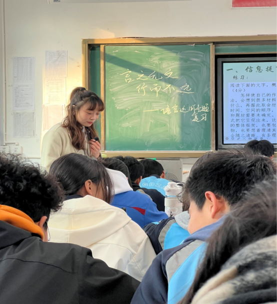 接到詹绪涛老师的任务以后,金外2024届语文组和赖世思琪老师高度重视,全力准备好这堂课。课堂的设计经过了精心的打磨,从一监考试习题出发,总结提炼方法,然后再推而广之延伸到课外的同类型习题。整堂课分了三个大的环节:一、信息的提取与概括;二、语言表达连贯;三、任务型仿写。这样的设计充分考虑了学生的认知过程:由易入难,由方法到实践,由已知到未知。层层深入的课堂也让学生收获颇丰。