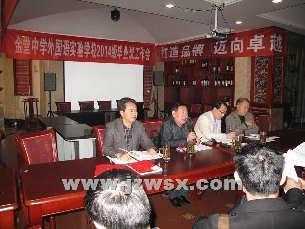 11月2日,金堂中学外国语实验学校2014级毕业工作会在中法风情小镇—彭州白鹿镇召开。会议由学校工会主席古代永主持。学校董事会董事长、校长龙崇志首先作了重要讲话,他特别强调了学校的稳定发展和毕业班工作的重要性。紧接着,学校、教务处、年级及班主任分层签订了目标责任书。会上,教师代表金洋琼、文萍老师,班主任代表肖乾敏老师,教研组长代表文俊福老师分别作了发言,特别是班主任代表肖乾敏老师的“三个一”做法赢得了与会人员的阵阵掌声。会议第四项年级分管领导王敏校长作了毕业班工作计划专题报告。最后分管教学副校长聂晓云作了“团结务实、精细管理、实干巧干、再创佳绩”的总结性发言:他通过对历史成绩的回顾和现实的分析,提出了2014级的优势与挑战,他希望2014级的每位老师认真思考与认识,做好自己的本职工作,秉承我校自强不息、勇争第一的传统和精神,要提振精气神、凝聚正能量,切实做到精诚团结、求真务实、开拓进取、努力拼搏、辛勤耕耘、无私奉献,用我们的汗水和智慧去创造更加优异的成绩,为学校打造品牌、迈向卓越做出更大的贡献!