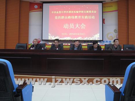 4月8日下午,中共金堂中学外国语实验学校支部委员会按照县教育局党委的统一部署和要求,在学校学术报告厅召开党的群众路线教育实践活动动员大会。参会人员有学校全体党员、全体行政干部、年级组长、教研组长、“两会一委员”代表、家长代表、社区代表以及教职工代表。金堂县教育实践活动第二督导小组组长王兴银同志及成员到会指导。会议由学校副校长王敏同志主持