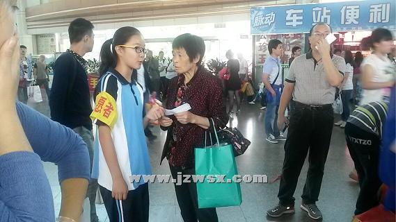 金堂中学外国语实验学校2017级1班的全体同学,在班主任老师黄烨的精心组织下,于国庆大假期间来到金堂县客运中心当志愿者,义务值勤。同学们每天早晨9:00来到车站,车站工作人员对其进行短期培训、分工后,便开始义工服务。每个同学穿着校服,佩戴志愿者袖套,不断地找寻需要帮助的对象:很热情地走过去,小心地伸出帮助的手,为别人提东西,为别人引路,主动去拣拾地上的垃圾,不断地提醒乘客主动进行安检、有序排队,过往行人向他们投去了惊奇羡慕赞扬的眼光。