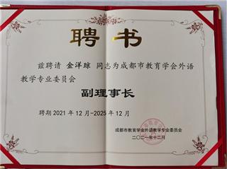 我校英语首席教师金洋琼同志当选成都市外语教学专业委员会副理事长卢孝艳同志当选理事